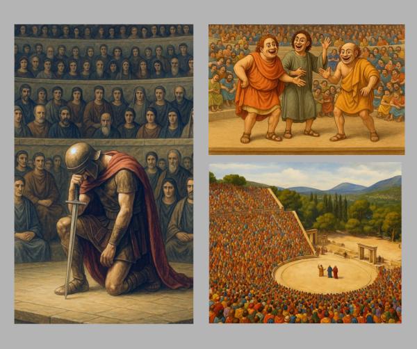 প্রাচীন গ্রিসের মানুষ আনন্দ করতে করতে বানিয়েছিল নাটক। থেসপিস ছিলেন প্রথম অভিনেতা। এস্কাইলাস, সফোক্লিস, ইউরিপিদিস, এরিস্টোেফেনিস–এঁরা নাটককে বানিয়েছিলেন সারা বিশ্বের শিল্প। আর অ্যারিস্টটল শিখিয়েছিলেন নাটকের নিয়ম, যা আজও মানা হয়। তাই বলা হয়, গ্রিক নাটকই হলো আধুনিক পৃথিবীর নাটক আর সিনেমার প্রথম শিক্ষক।
