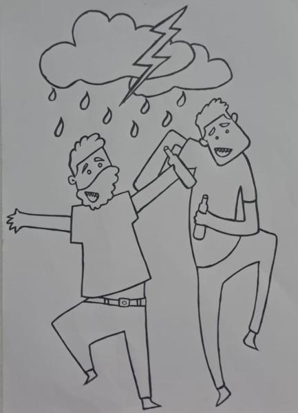 ১ম মাতাল : ভাই আকাশ ফুটো হয়ে গেছে। চল, কোনও ছাউনির নিচে দাঁড়াই।