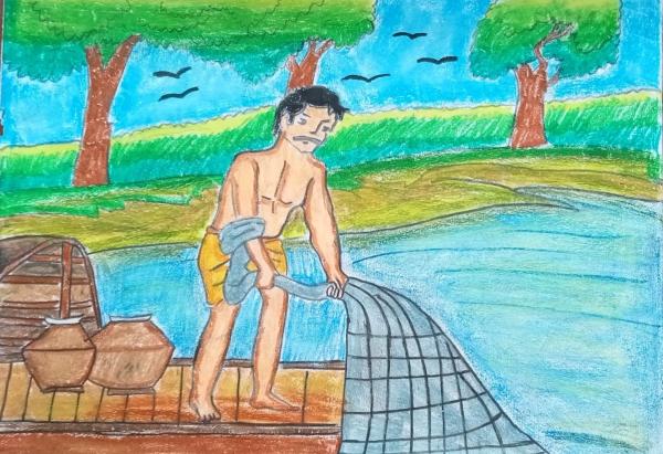 জাল ফেলে মাছ ধরে জেলে